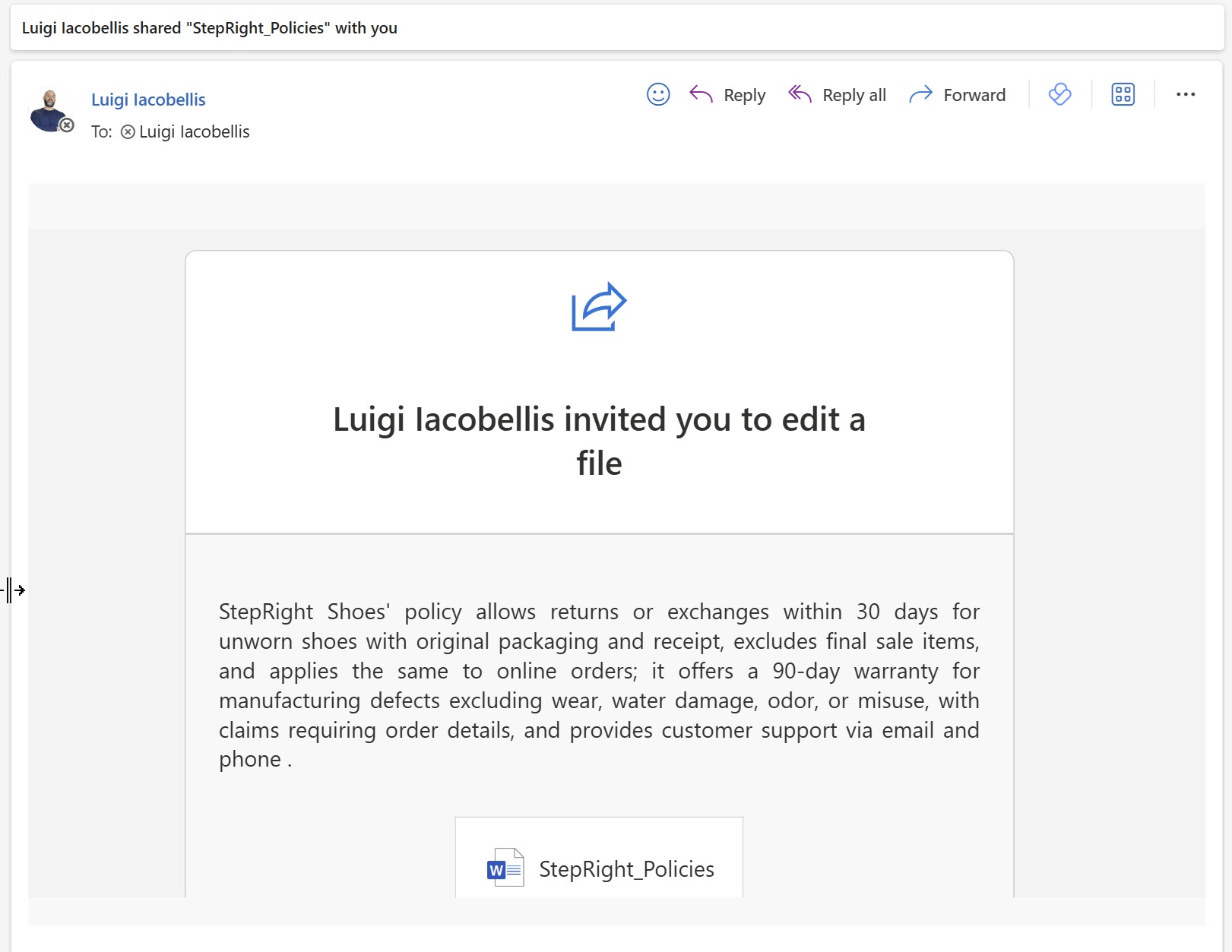 Below is a snippet of the share notification the recipient receives, including the custom file summary generated by Copilot.